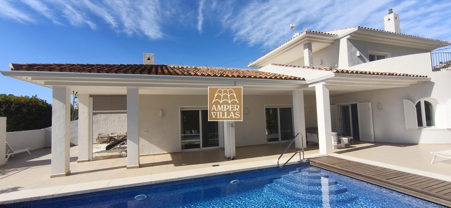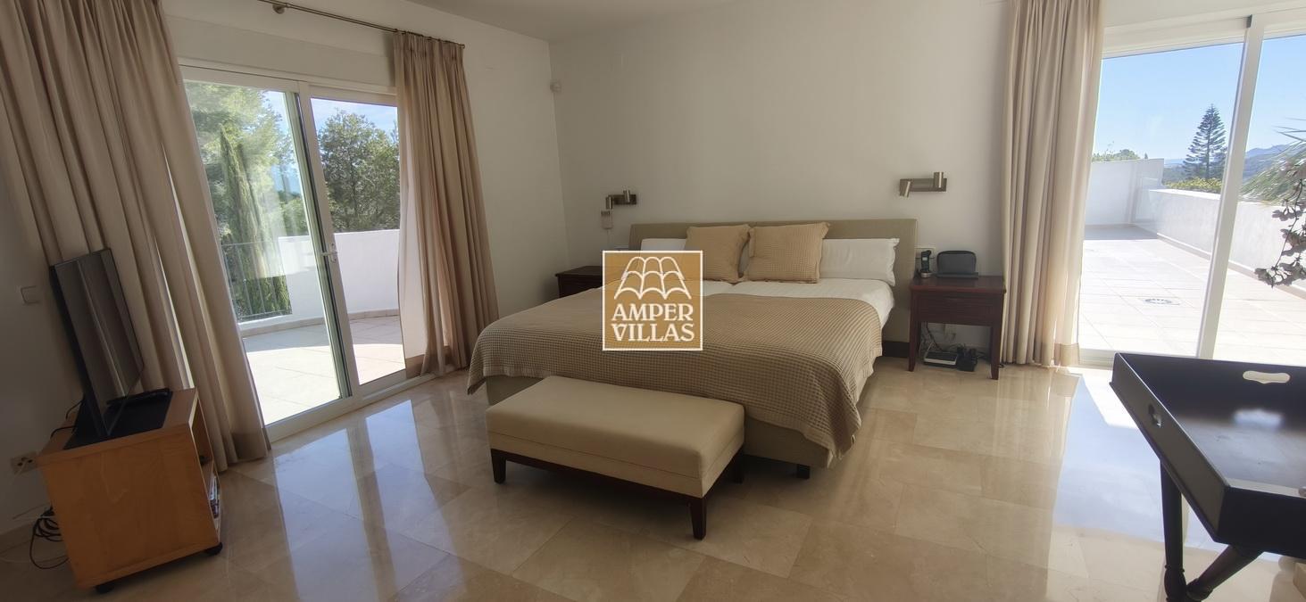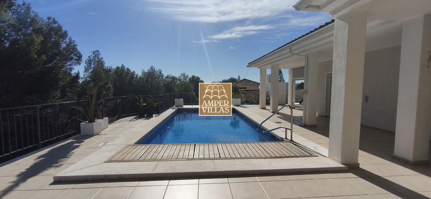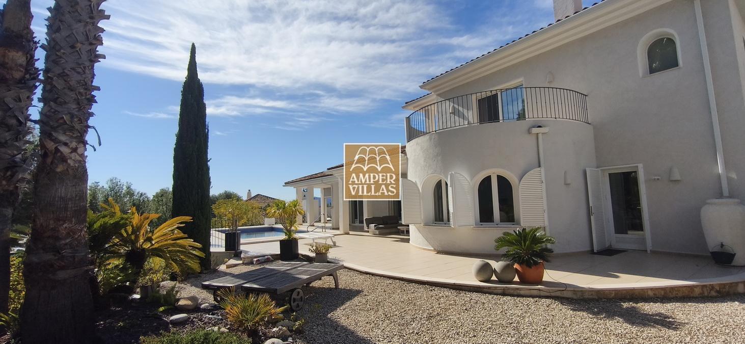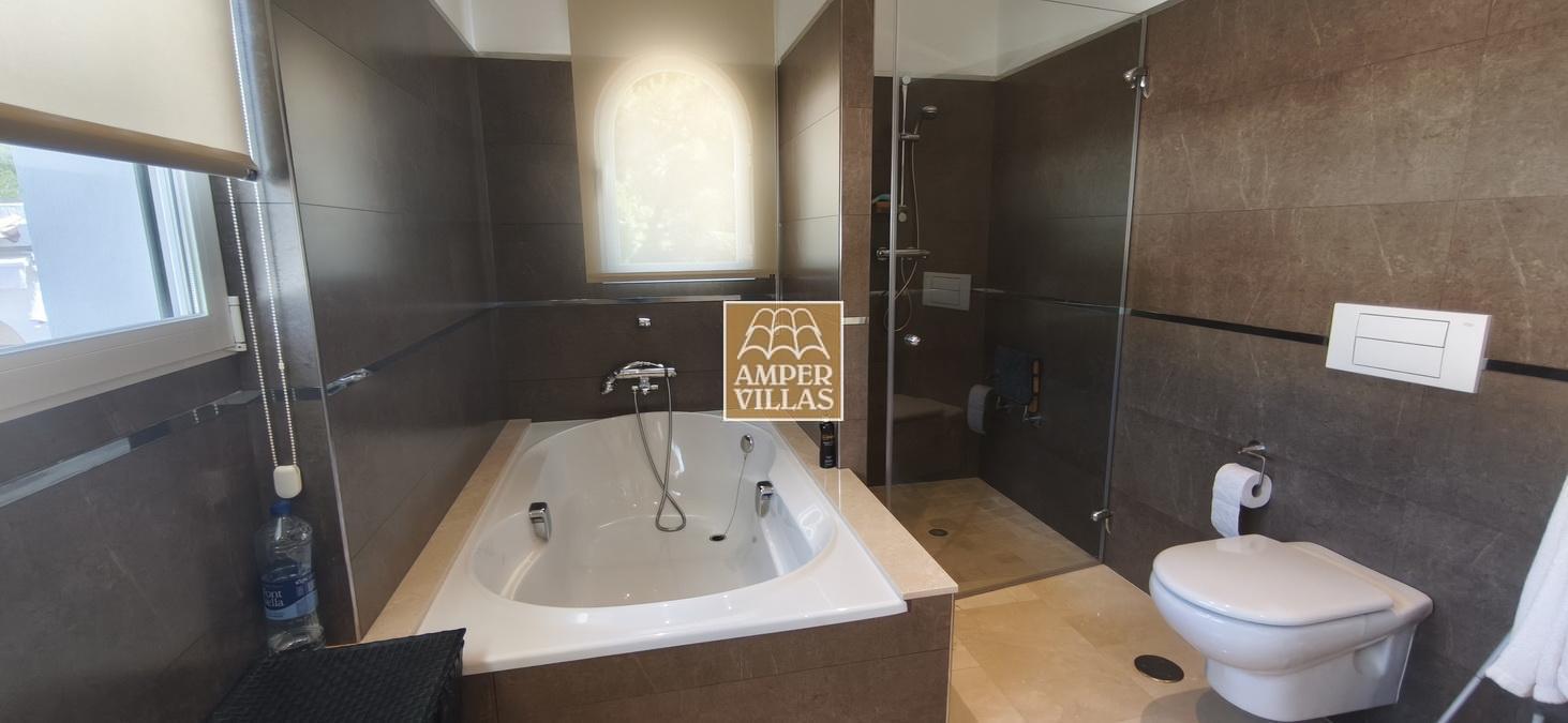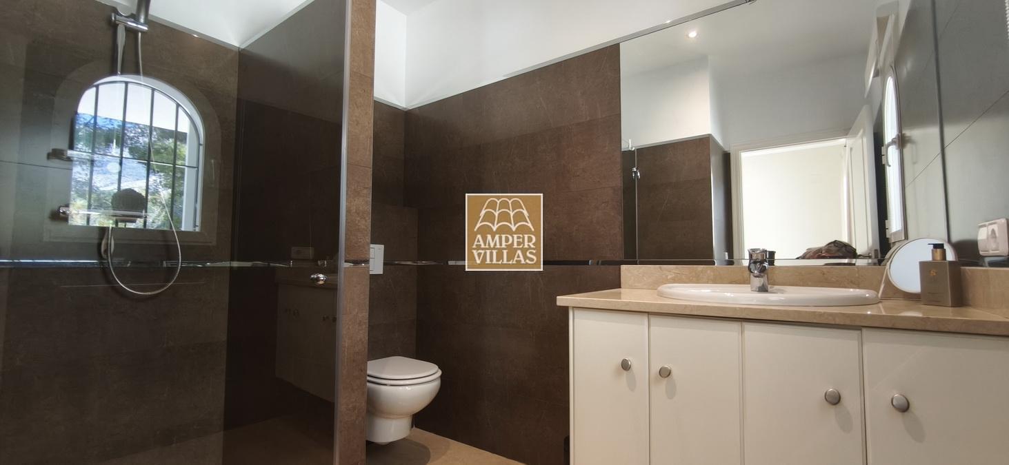 Fantastic villa in a quiet setting with, on the ground floor: entrance hall, living/dining room with semi-open kitchen, 2 large bedrooms with fitted wardrobes and each with en-suite bathroom, guest toilet and laundry room. All rooms have access to a large terrace with a heated swimming pool and barbecue area. On the first floor is the master bedroom with en-suite bathroom and 2 large terraces with beautiful green and sea views.