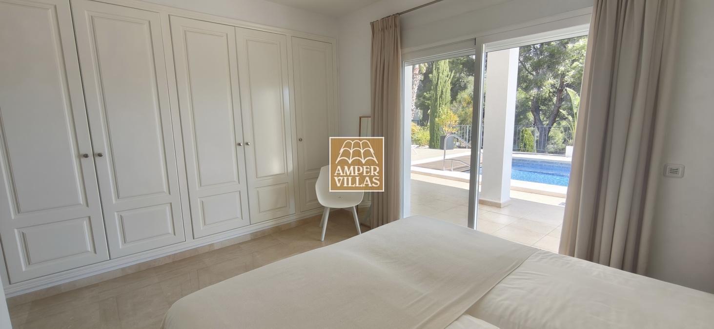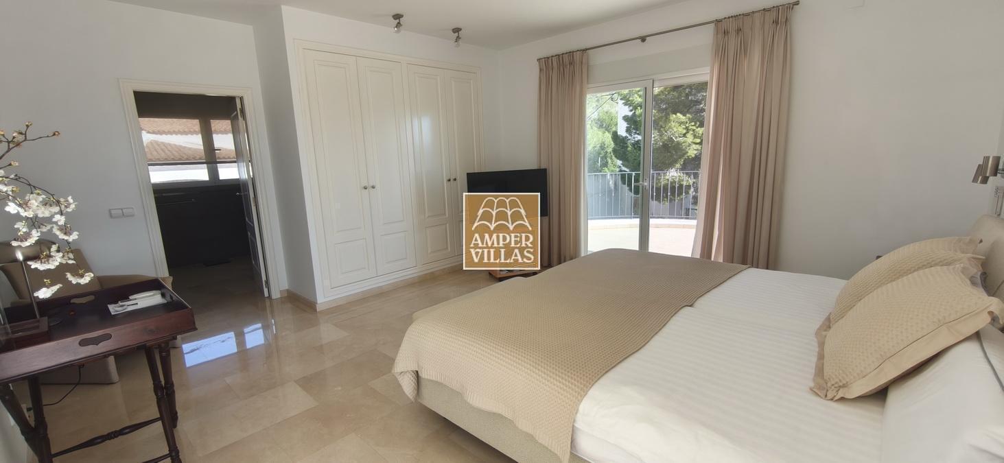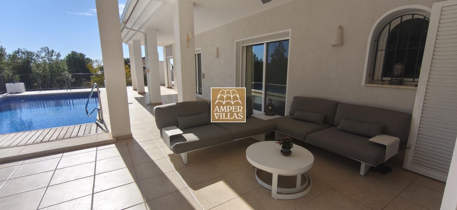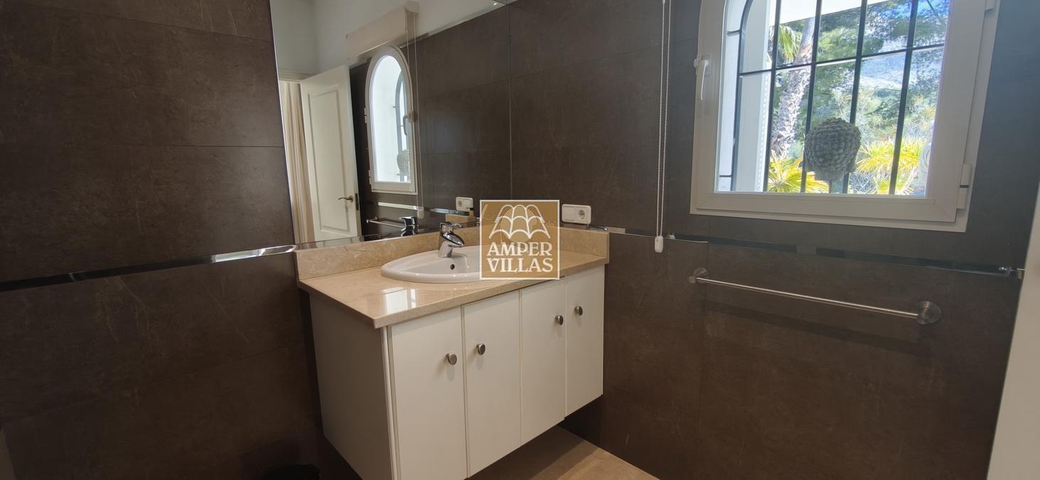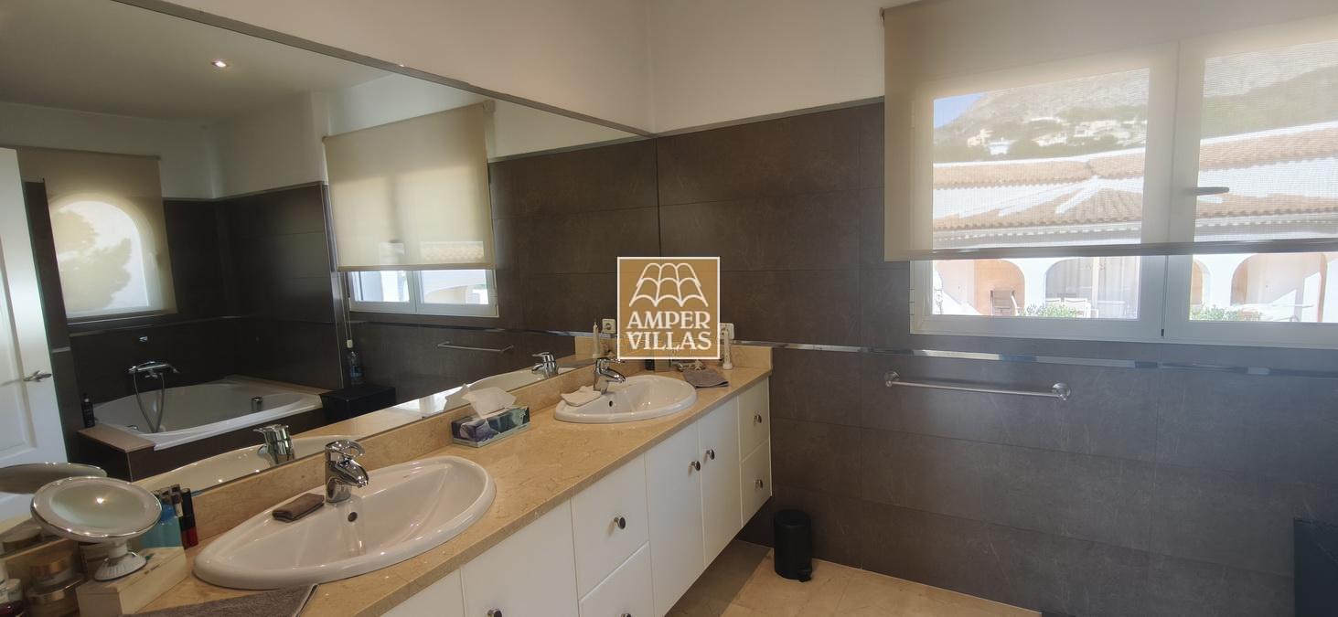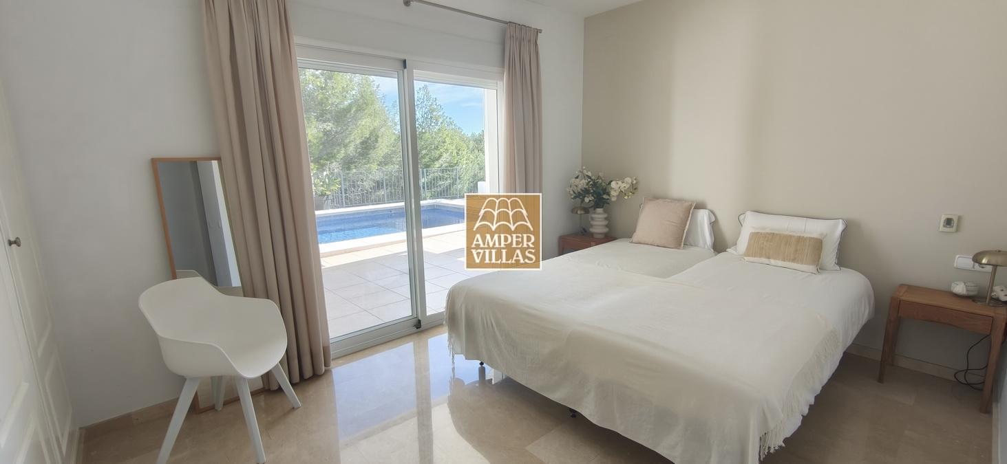 Fantastic villa in a quiet setting with, on the ground floor: entrance hall, living/dining room with semi-open kitchen, 2 large bedrooms with fitted wardrobes and each with en-suite bathroom, guest toilet and laundry room. All rooms have access to a large terrace with a heated swimming pool and barbecue area. On the first floor is the master bedroom with en-suite bathroom and 2 large terraces with beautiful green and sea views.