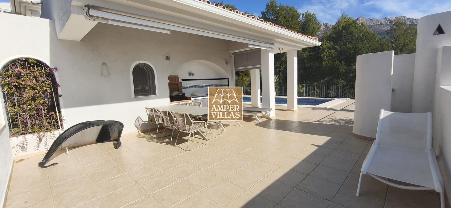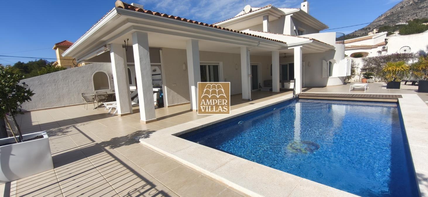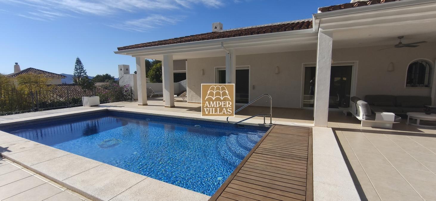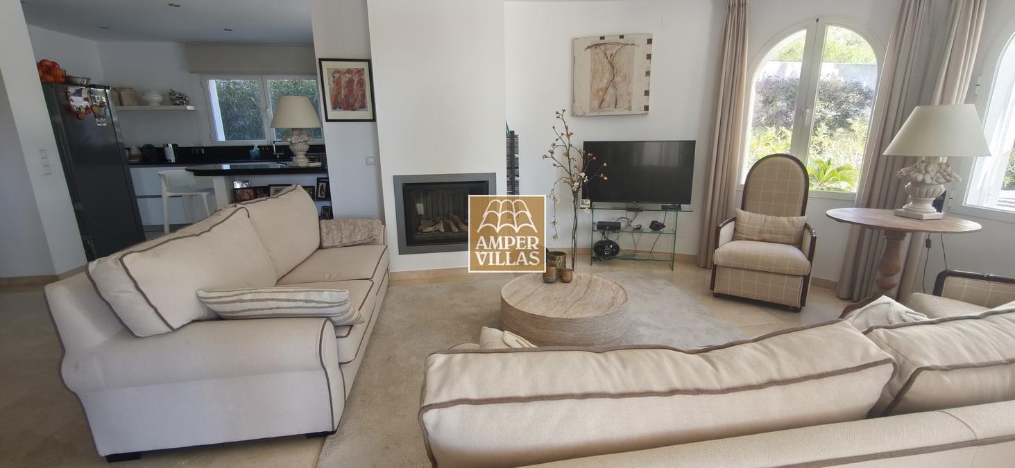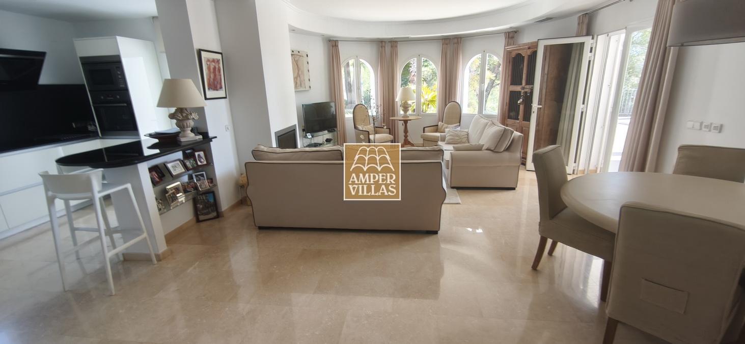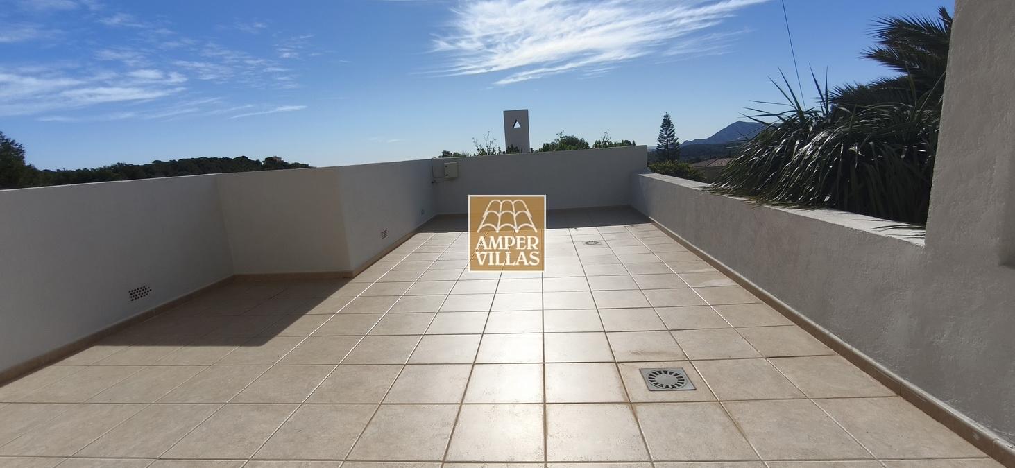 Fantastic villa in a quiet setting with, on the ground floor: entrance hall, living/dining room with semi-open kitchen, 2 large bedrooms with fitted wardrobes and each with en-suite bathroom, guest toilet and laundry room. All rooms have access to a large terrace with a heated swimming pool and barbecue area. On the first floor is the master bedroom with en-suite bathroom and 2 large terraces with beautiful green and sea views.