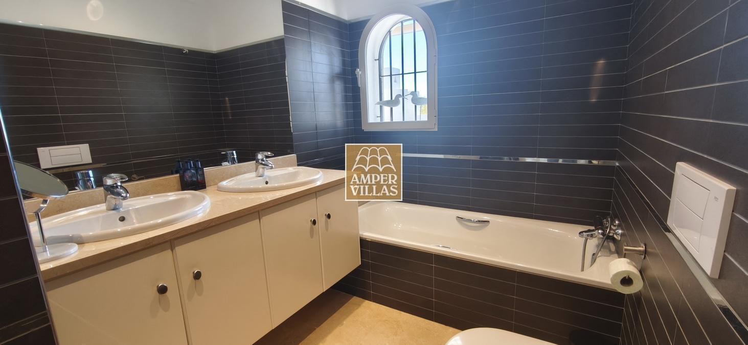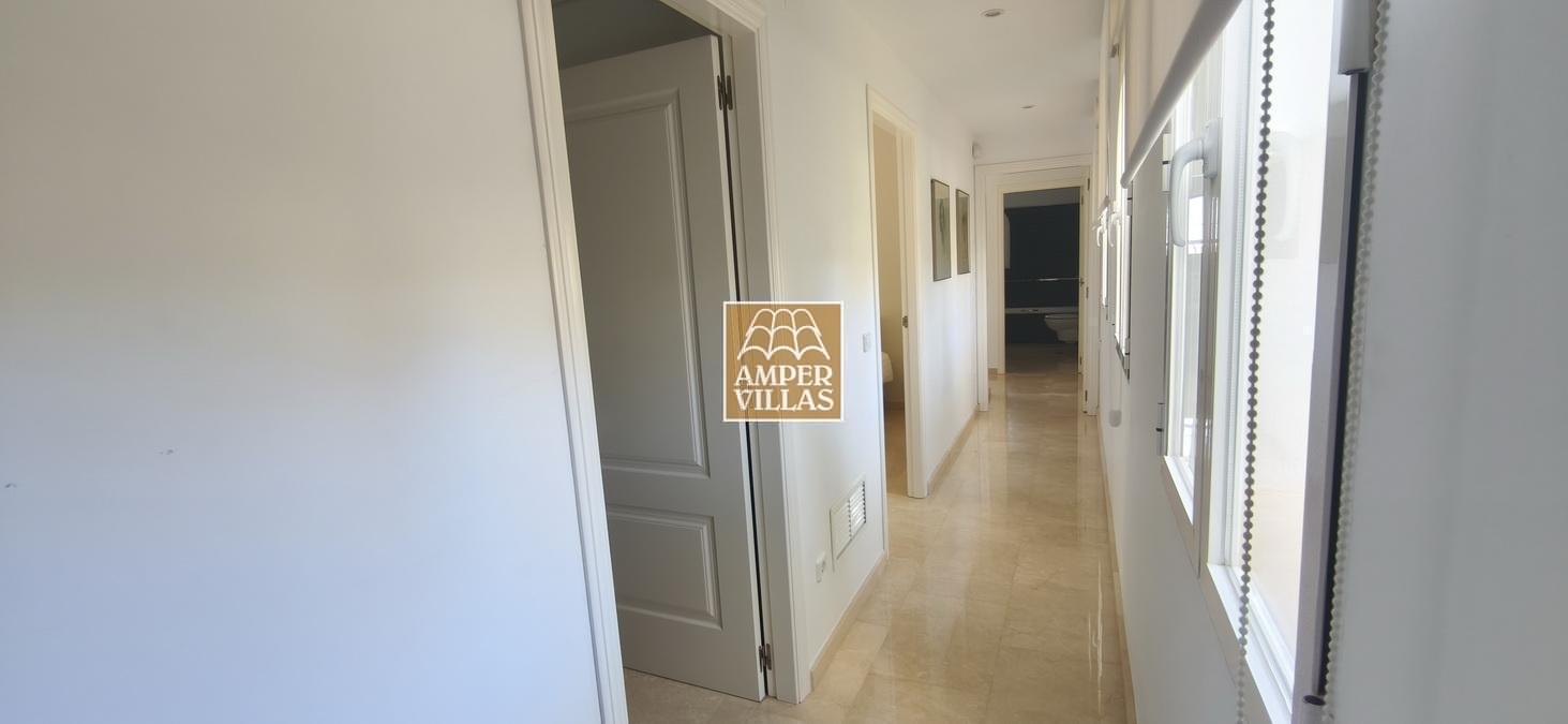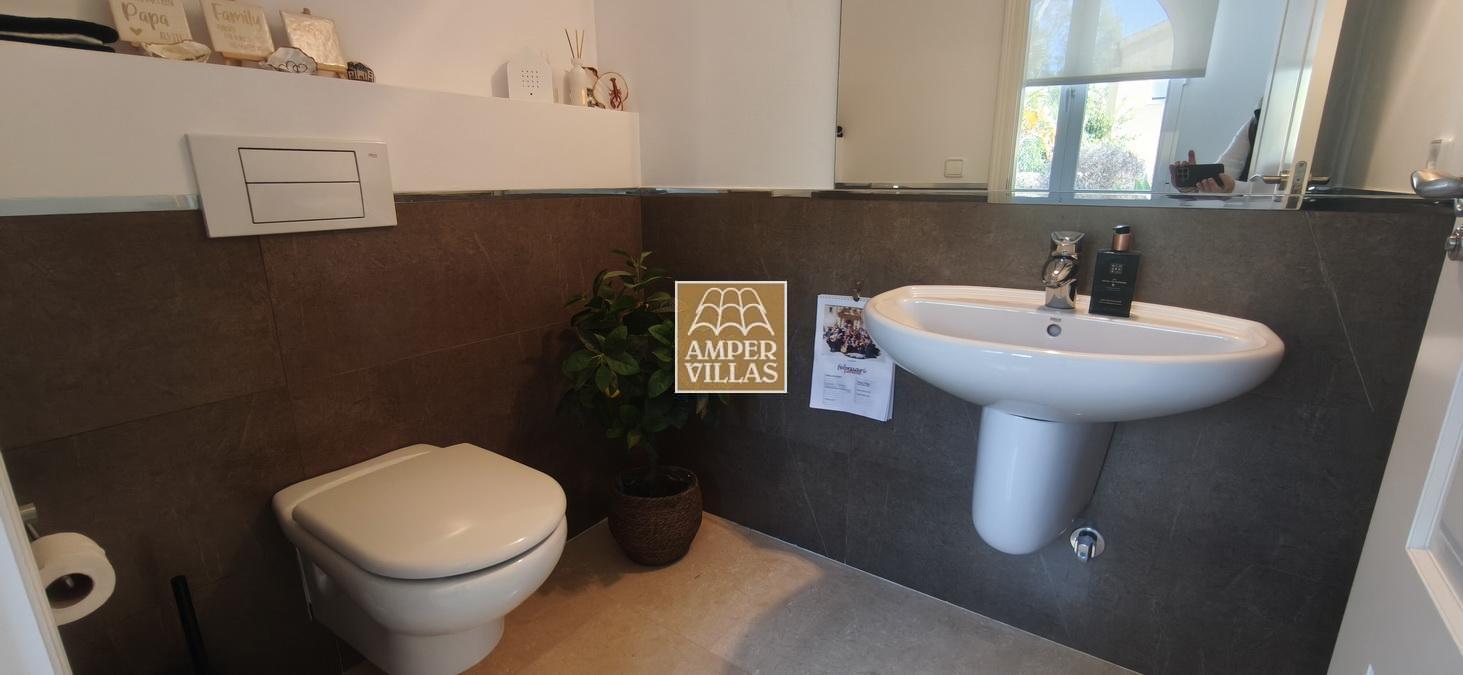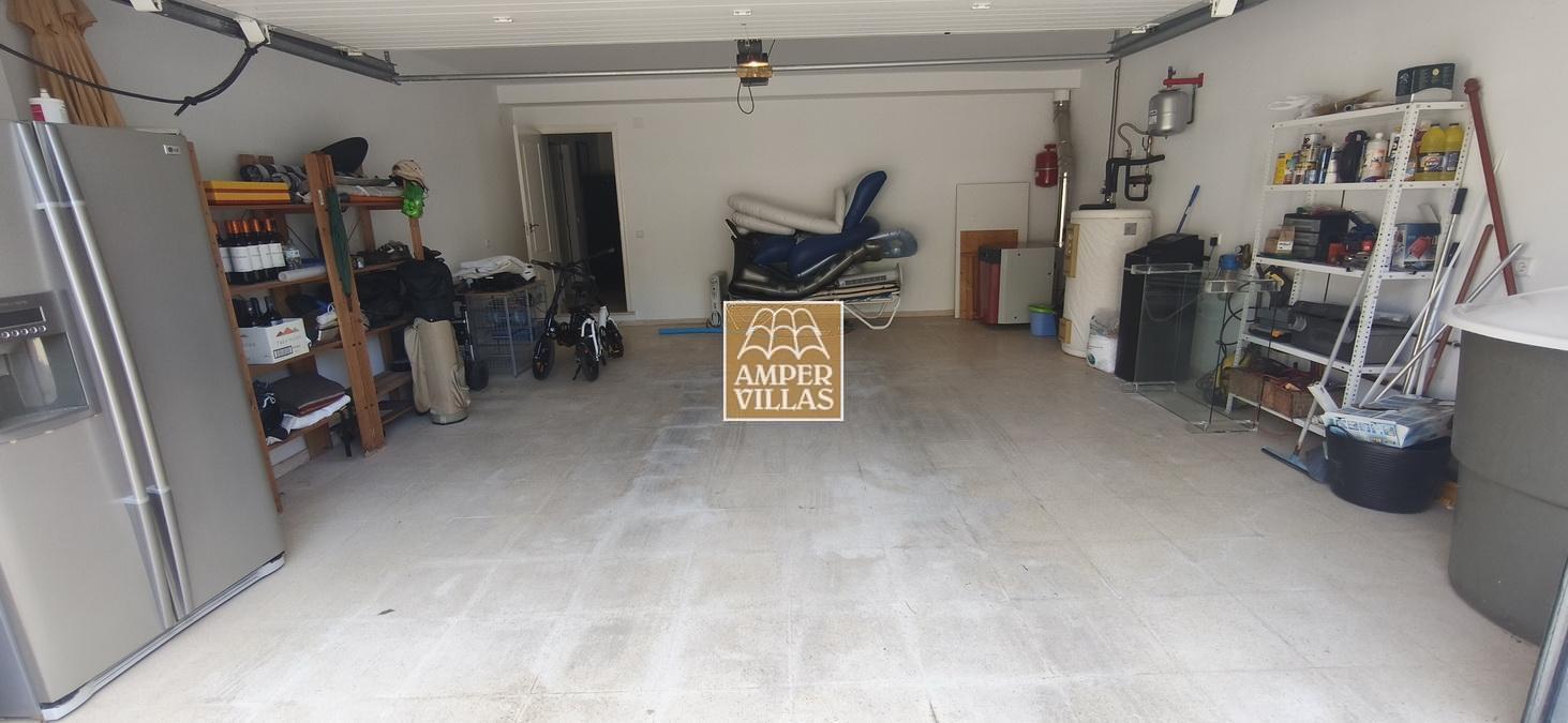 On the lower floor there is another bedroom with its own en-suite bathroom and direct access to the garden, a large garage and a storage room. The house has all the amenities, such as: underfloor heating, air conditioning, tilt and turn windows, mosquito nets, electric shutters, water softener system.