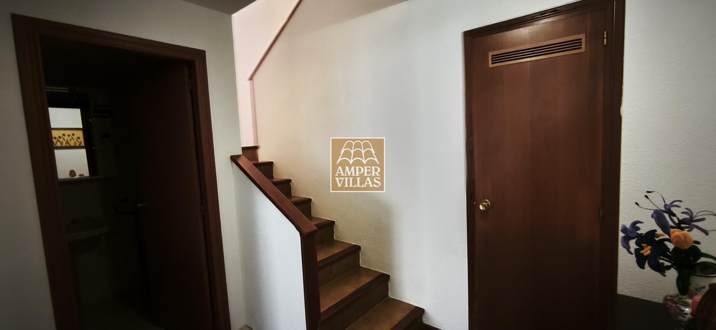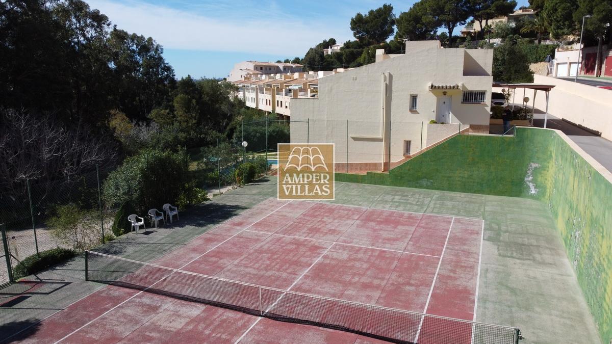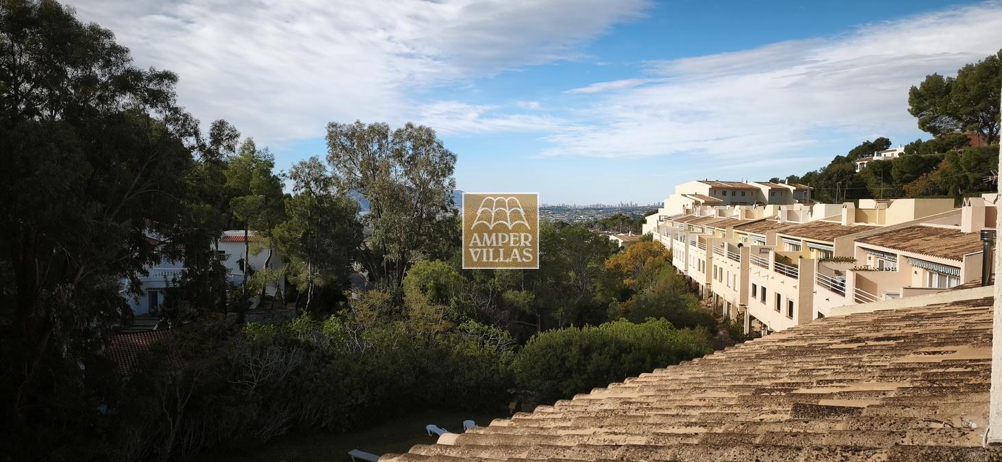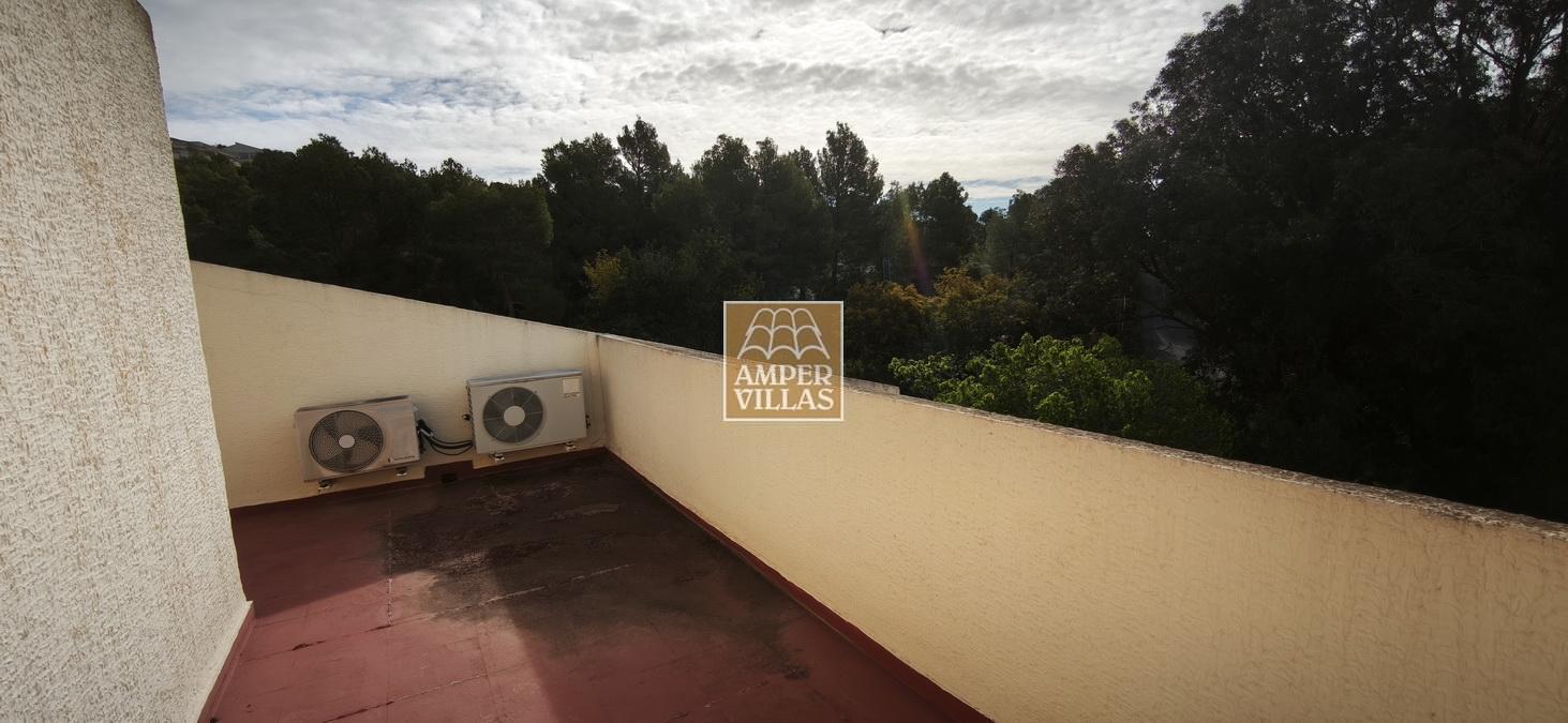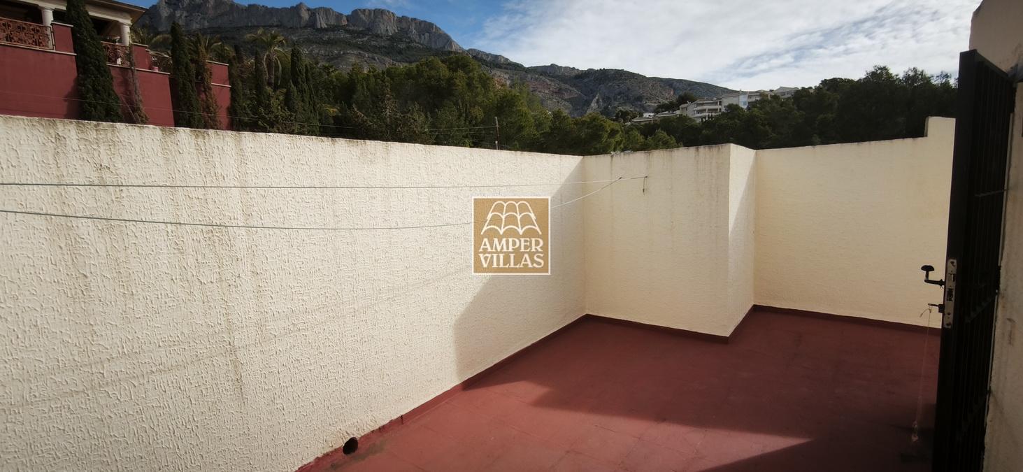 A cosy and spacious corner bungalow, close to the golf club, featuring an entrance hall, a living-dining room opening onto a terrace with lovely views of the greenery, the swimming pool and Altea Bay, a separate kitchen, a guest toilet and a separate utility room. On the ground floor there are 2 bedrooms, 2 bathrooms and a further storage room. On the upper floor there is a sun terrace. The property has hot/cold air conditioning and a fireplace. There is a parking space in front of the house, a communal swimming pool and a tennis court.