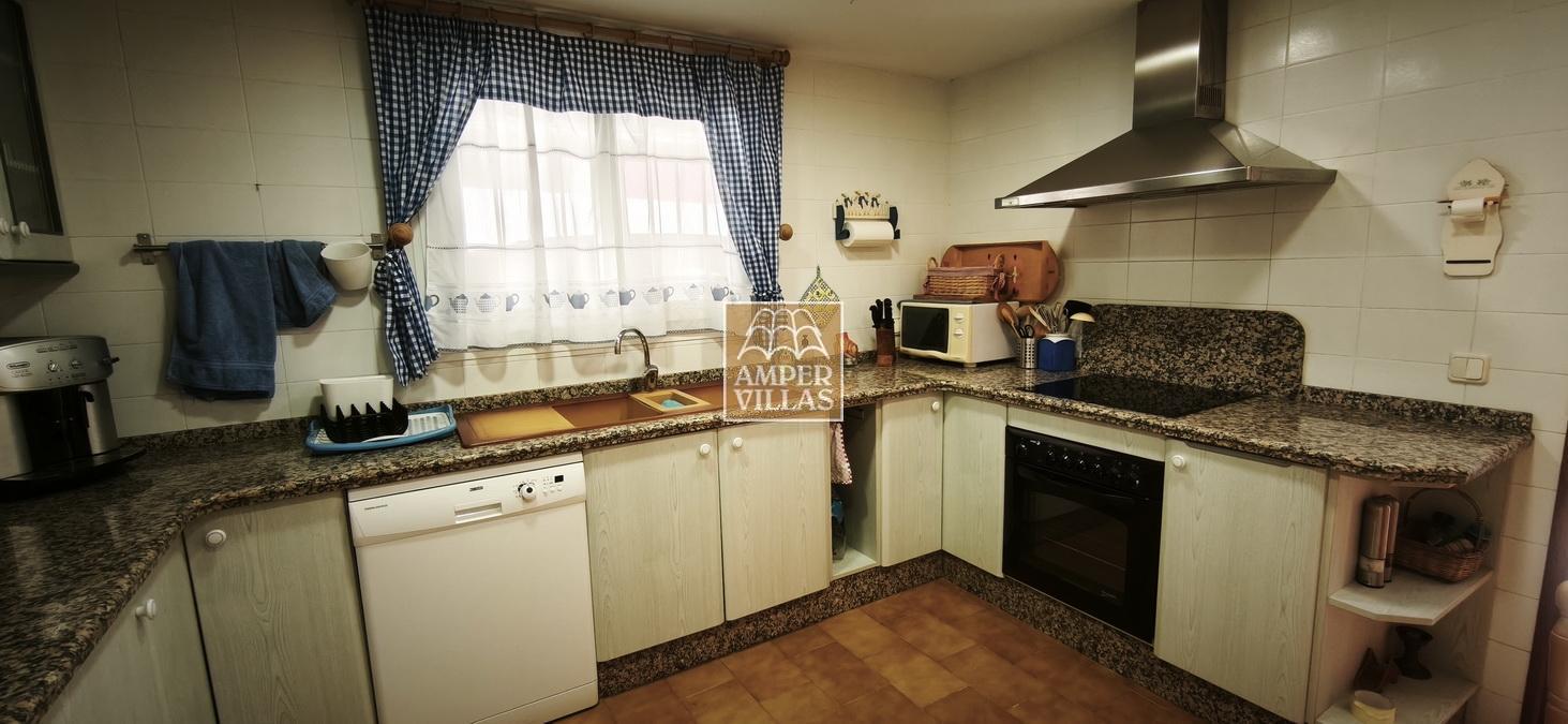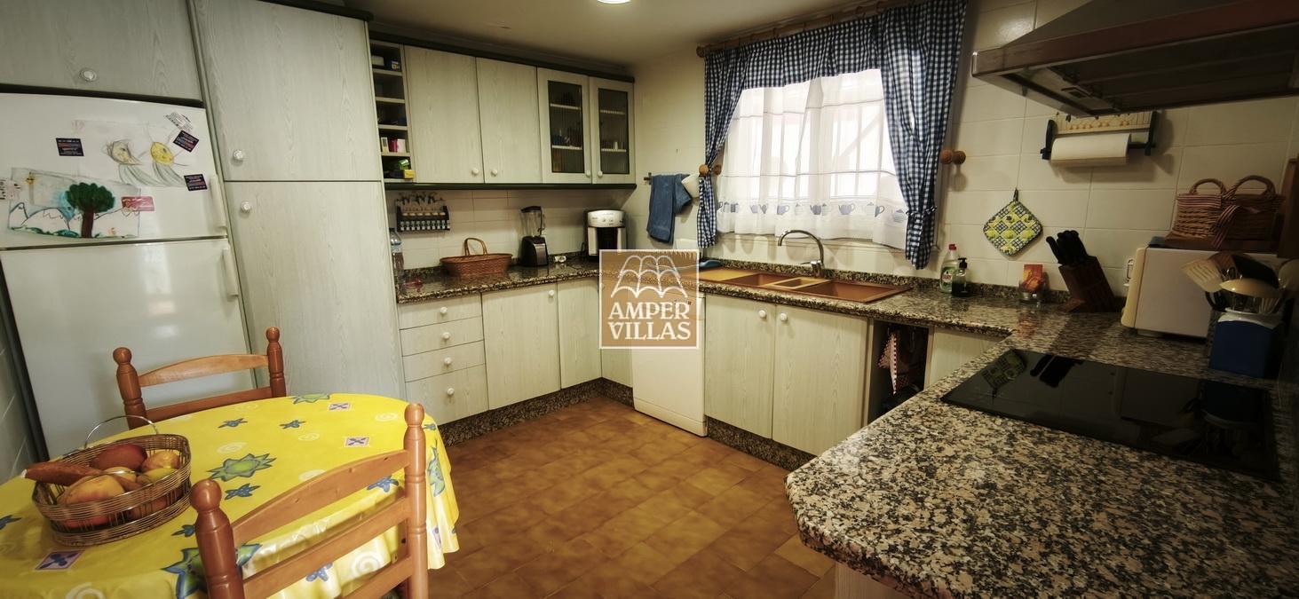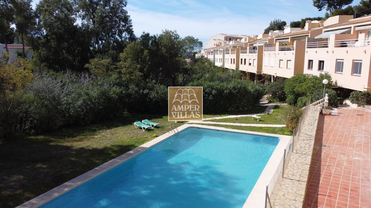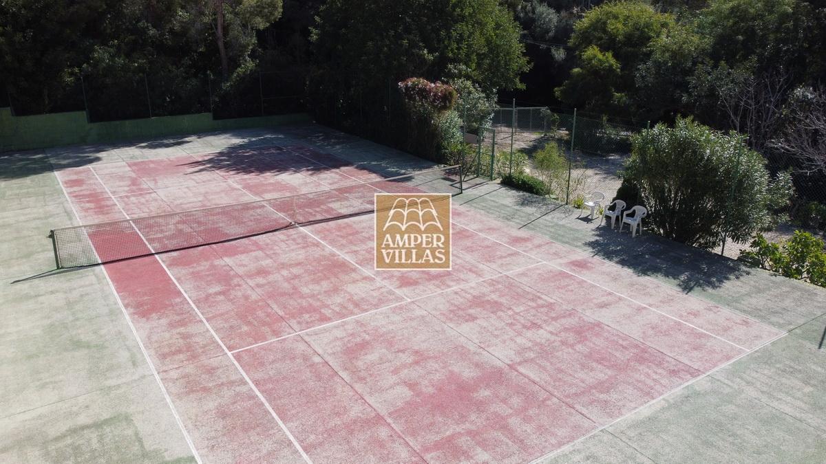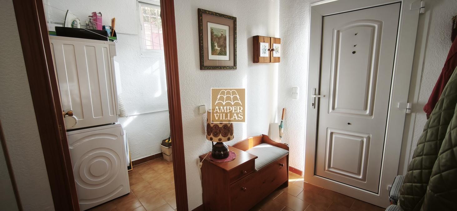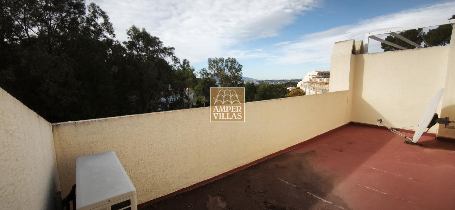 A cosy and spacious corner bungalow, close to the golf club, featuring an entrance hall, a living-dining room opening onto a terrace with lovely views of the greenery, the swimming pool and Altea Bay, a separate kitchen, a guest toilet and a separate utility room. On the ground floor there are 2 bedrooms, 2 bathrooms and a further storage room. On the upper floor there is a sun terrace. The property has hot/cold air conditioning and a fireplace. There is a parking space in front of the house, a communal swimming pool and a tennis court.
